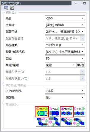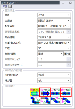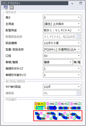 高さが異なる配管を接続する際、「90°エルボ」「45°エルボ」どちらの部品を使用するか、1点目と2点目のどちらで高さを変更するかを[コマンドプロパティ]の[作図選択]で選択します。
