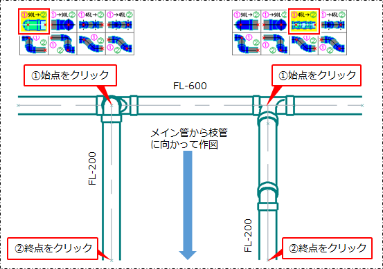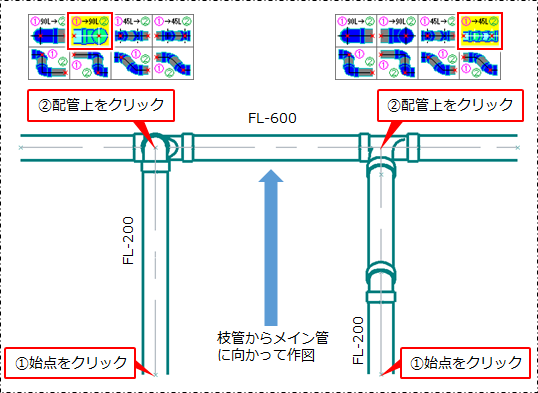 既存の配管側から作図する場合と、既存の配管に向かって作図する場合の差異を確認してください。
