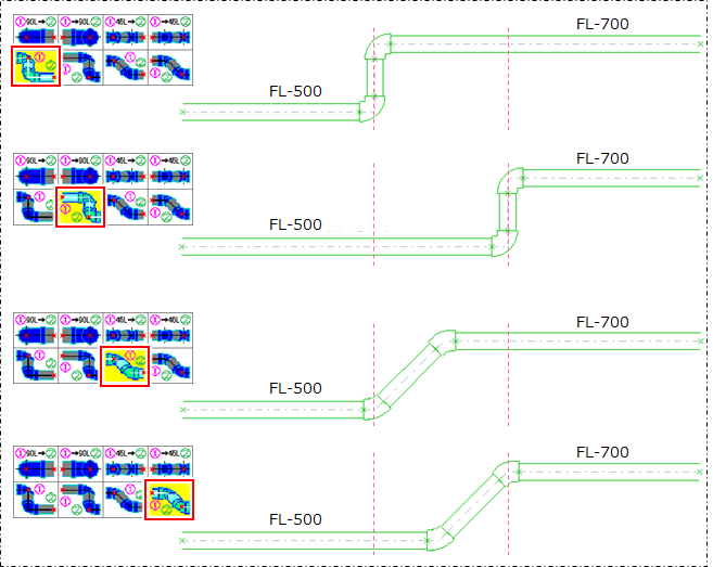4つの作図パターンの差異は「90°エルボ」「45°エルボ」どちらの部品を使用するか、また、1点目と2点目のどちらの位置を保持して接続するか、ということになります。
