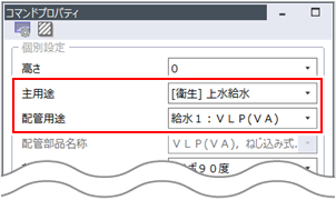 )をクリックして実行し、[コマンドプロパティ]で接続する配管の用途を設定します。
