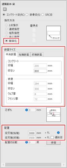 梁の中央断面のサイズを入力します。 コンクリート梁
