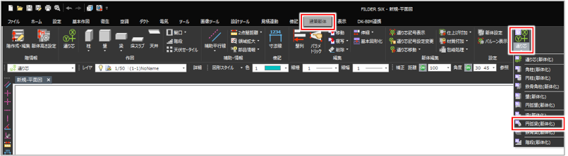 [建築躯体]タブの[通り芯]プルダウンメニューから[円弧梁(躯体化)]コマンド(