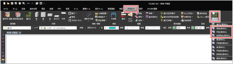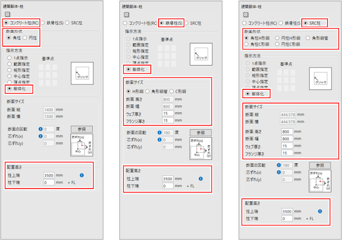 柱の種類を選択して、[指示方法]で[躯体化]を選択し、作図方法を設定します。