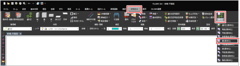 [建築躯体]タブの[通り芯]プルダウンメニューから、[壁(躯体化)]コマンド(