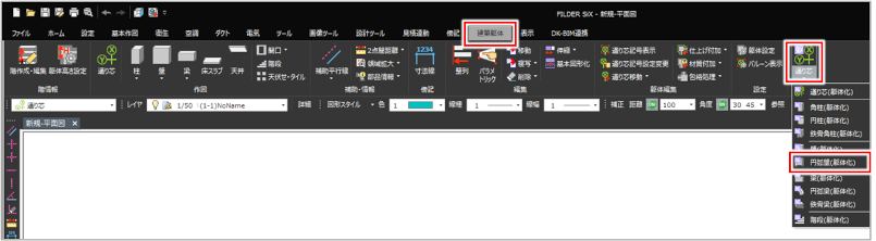 [建築躯体]タブの[通り芯]プルダウンメニューから、[円弧壁(躯体化)]コマンド(