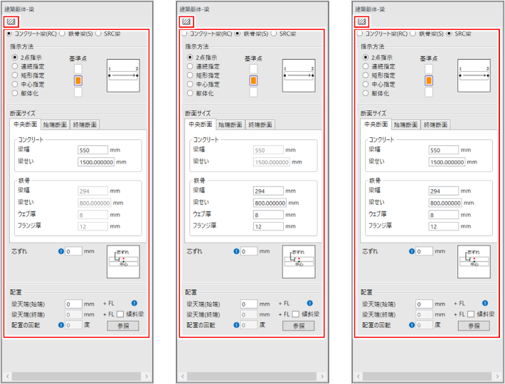 SRC梁を配置する基準位置を、上面、中心、下面からクリックして選択します。 [指示方法]で[2点指示][連続指定]を選択した場合に設定できます。 |