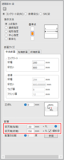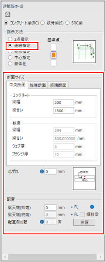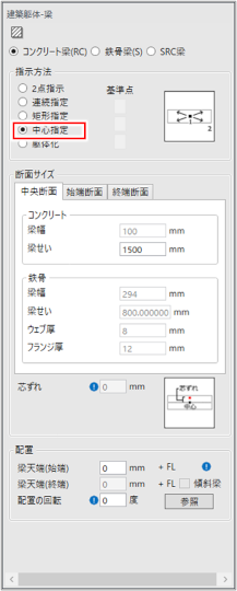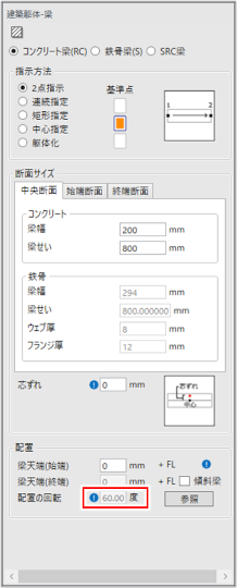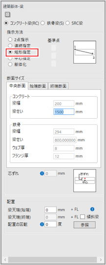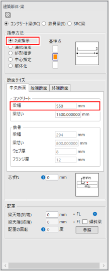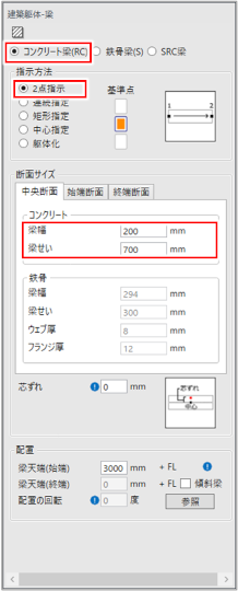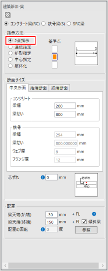 [指示方法]で[2点指示]を選択し、[梁幅]と[梁せい]を設定します。