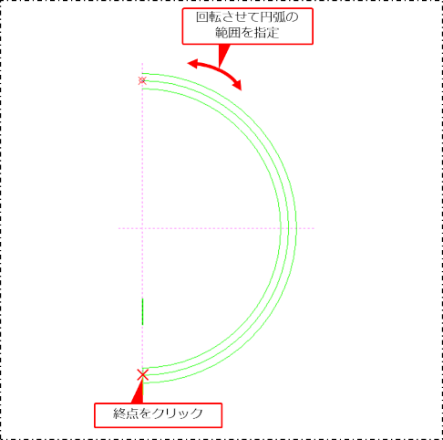 [断面サイズ]で[マウス指示]を選択した場合は、終点をクリックした後、梁幅の配置方向(円弧の外側か内側)をクリックします。