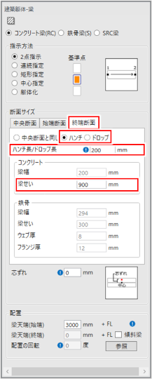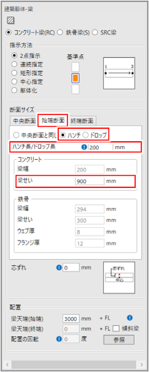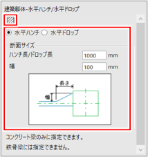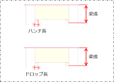 ここでは、例として[ハンチ]を選択し、[ハンチ長/ドロップ長][梁せい]を設定します。