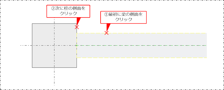 水平ハンチまたは水平ドロップを付加したい梁の側面をクリックしてから、柱の側面をクリックします。