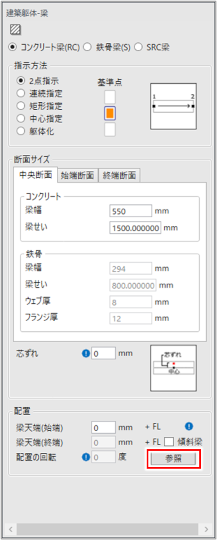 梁を回転して配置する場合に回転角度を入力します。 配置済みの梁の回転角度を参照して適用するときは、[参照]ボタンをクリックします。操作方法について、詳しくは以下を参照してください。 |