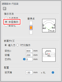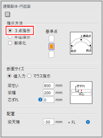 [断面サイズ]で[値入力]を選択した場合は、[基準点][梁幅][芯ずれ]の設定に従って円弧梁が作図されます。