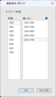 [コンクリート]の[梁リスト]ボタンを押下することで、リストからコンクリート断面寸法を選択できます。