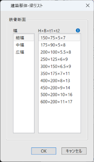 [鉄骨]の[梁リスト]ボタンを押下することで、リストから断面寸法を選択できます。