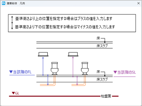 をクリックすると[建築躯体 凡例]ウィンドウが表示され、梁の配置高さのイメージを確認できます。