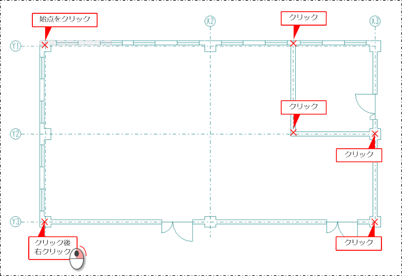 線が交差しないように、頂点をクリックして床スラブを描画します。