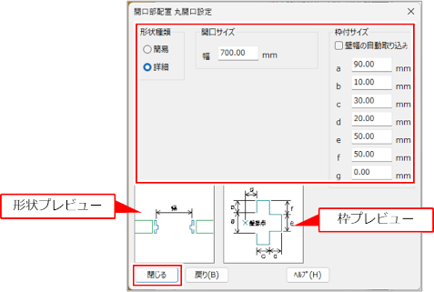 作図する開口部の種類を選択します。 ここでは[丸開口]を選択します。 [配置先]で[壁]を選択した場合は、詳しい形状を設定できます。[詳細]ボタンをクリックすると、[開口部配置 丸開口設定]ダイアログが表示されます。 [形状種類]を選択して、[開口サイズ][枠付サイズ]を設定し、[閉じる]ボタンをクリックします。