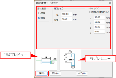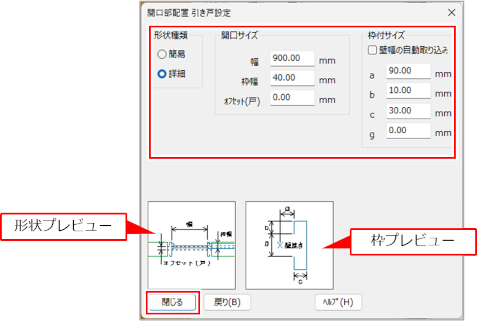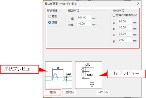 作図するクローゼット・アコーディオンの種類を選択します。 ここでは[片クローゼット]を選択します。 詳しい形状を設定する場合は、[詳細]ボタンをクリックすると、選択したクローゼット・アコーディオンの種類に応じて、開口部配置の設定ダイアログが表示されます。 [形状種類]を選択して、[開口サイズ][枠付サイズ]を設定し、[閉じる]ボタンをクリックします。