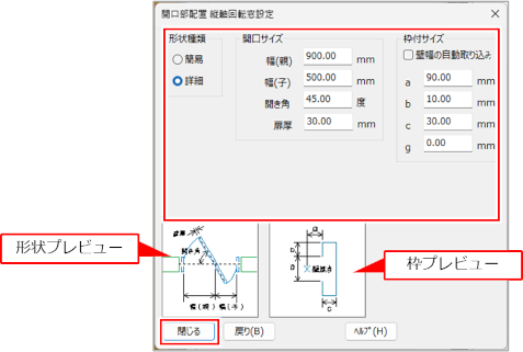 作図する窓の種類を選択します。 ここでは[縦軸回転窓]を選択します。 詳しい形状を設定する場合は、[詳細]ボタンをクリックすると、[開口部配置 縦軸回転窓設定]ダイアログが表示されます。 [形状種類]を選択して、[開口サイズ][枠付サイズ]を設定し、[閉じる]ボタンをクリックします。