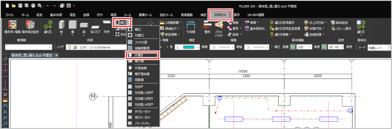 [建築躯体]タブの[開口]プルダウンメニューから[片開き]コマンド(