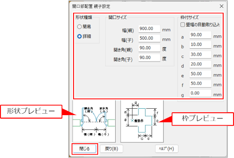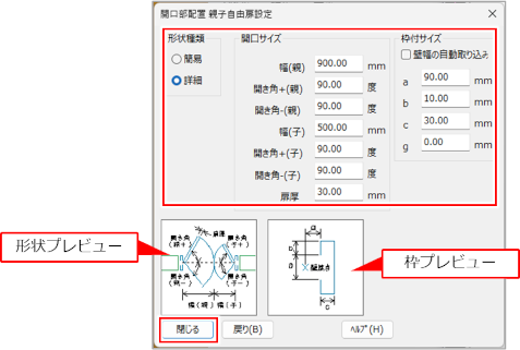 作図する扉の種類を選択します。 ここでは[親子自由扉]を選択します。 詳しい形状を設定する場合は、[詳細]ボタンをクリックすると、[開口部配置 親子自由扉設定]ダイアログが表示されます。 [形状種類]を選択して、[開口サイズ][枠付サイズ]を設定し、[閉じる]ボタンをクリックします。