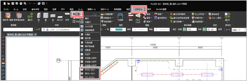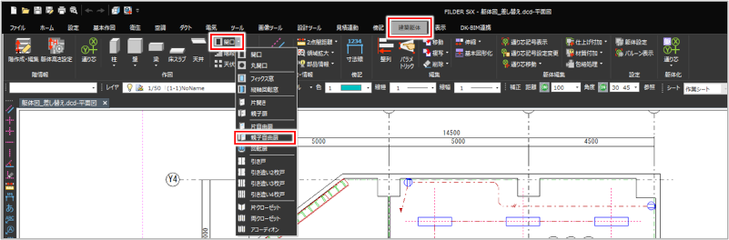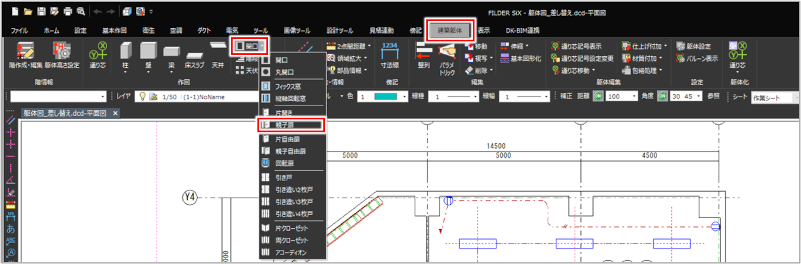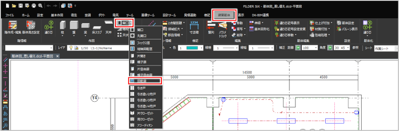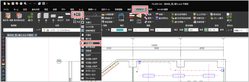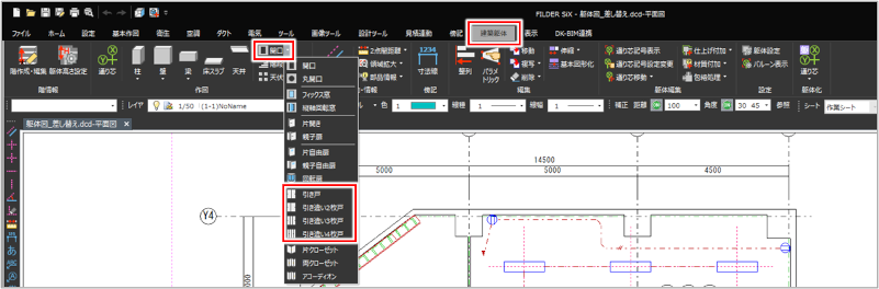 [建築躯体]タブの[開口]プルダウンメニューから[親子自由扉]コマンド(