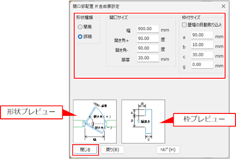 作図する扉の種類を選択します。 ここでは[片自由扉]を選択します。 詳しい形状を設定する場合は、[詳細]ボタンをクリックすると、[開口部配置 片自由扉設定]ダイアログが表示されます。 [形状種類]を選択して、[開口サイズ][枠付サイズ]を設定し、[閉じる]ボタンをクリックします。