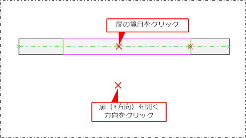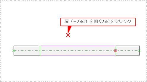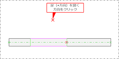 親子自由扉の扉(親)と扉(子)の境目をクリックしてから、扉(+方向)を開く方向をクリックします。