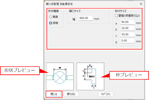 作図する開口部の種類を選択します。 ここでは[開口]を選択します。 [配置先]で[壁]を選択した場合は、詳しい形状を設定できます。[詳細]ボタンをクリックすると、[開口部配置 開口設定]ダイアログが表示されます。 [形状種類]を選択して、[開口サイズ][枠付サイズ]を設定し、[閉じる]ボタンをクリックします。