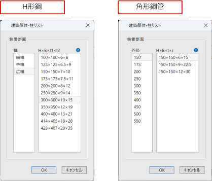 [柱リスト]ボタンを押下することで、リストから断面寸法を選択できます。 [H形鋼][角形鋼管]を選択している場合に設定できます。