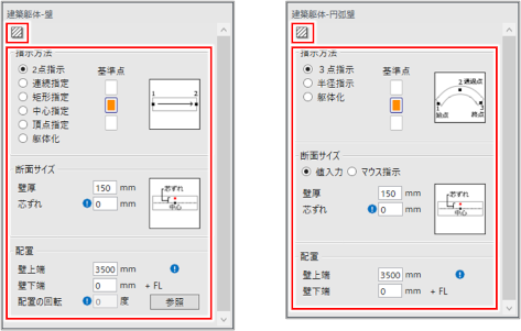 [建築躯体-壁]または[建築躯体-円弧壁]ダイアログが表示されます。