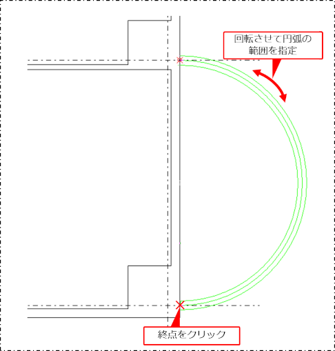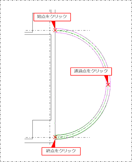 [断面サイズ]で[マウス指示]を選択した場合は、終点をクリックした後、壁厚の配置方向(円弧の外側か内側)をクリックします。