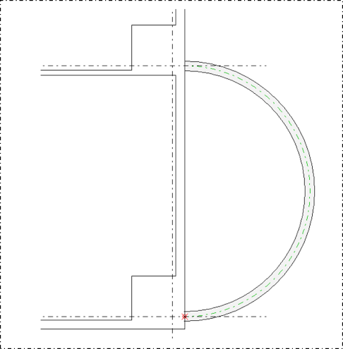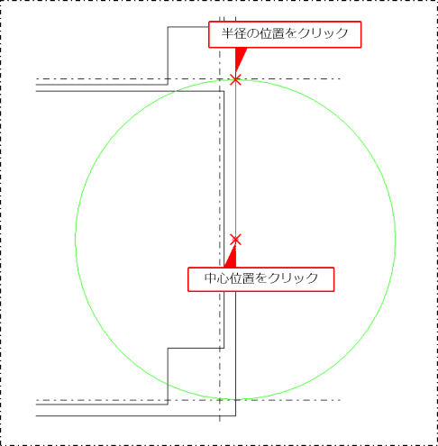 円弧の中心位置に補助線などがある場合は、半径を指示して円弧壁を作図します。