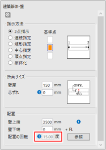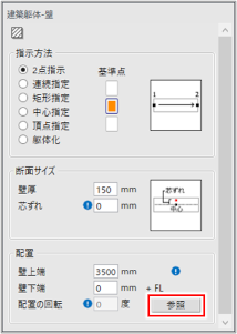 壁を回転して配置する場合に回転角度を入力します。 配置済みの壁の回転角度を参照して適用するときは、[参照]ボタンをクリックします。操作方法について、詳しくは以下を参照してください。 |
