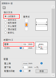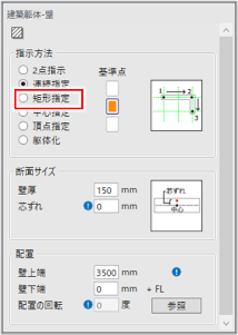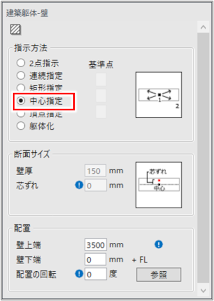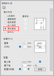 壁を配置する基準位置をクリックして選択します。 [指示方法]で[2点指示][連続指定]を選択した場合に設定できます。 |