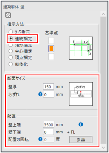 [指示方法]で[連続指定]を選択し、[断面サイズ]などの詳細設定を行います。