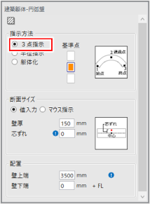 円弧壁を配置する基準位置をクリックして選択します。 [指示方法]で[3点指示][半径指示]を選択した場合に設定できます。 |