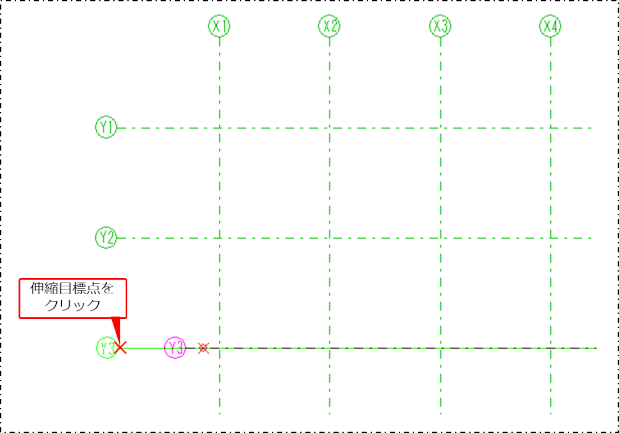 [建築躯体]タブの[通り芯移動]プルダウンメニューから[通り芯伸縮]コマンド(