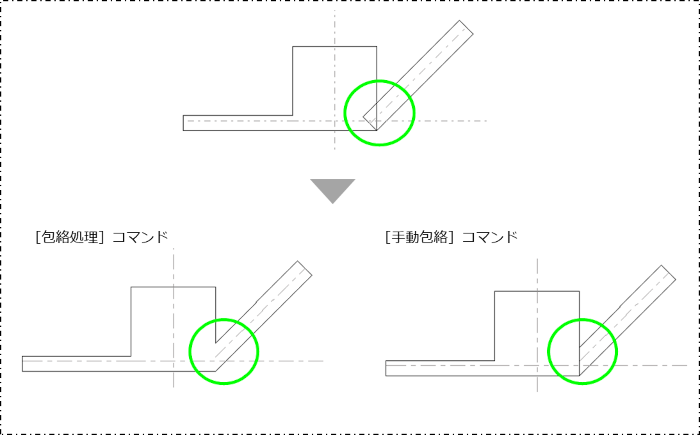 例えば、[包絡処理]コマンドで自動包絡した場合と[手動包絡]コマンドで線を非表示にした場合では、以下のような違いがあります。