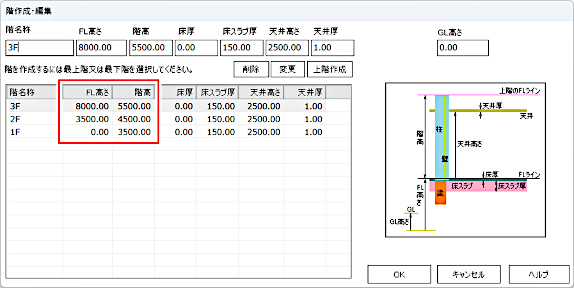 Z座標はシートの階設定に基づき下記の通り出力します。 -[インサート]を選択した場合 インサートが所属するシートに階設定が無い場合:0を出力します。 インサートが所属するシートに階設定がある場合:シートのFL高さ+階高を出力します。 -[スリーブ]を選択した場合 1FL基準位置からのスリーブ高さ(上端)を出力します。 -[任意の点]を選択した場合 カレントシートに階設定が無い場合:0を出力します。 カレントシートに階設定がある場合:シートのFL高さ+階高を出力します。 例:図面の「階作成・編集」が下記の設定になっている場合