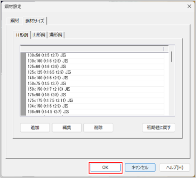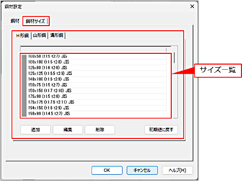 [鋼材設定]ダイアログで、作図する鋼材のサイズを追加・編集できます。
