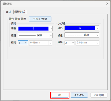 [鋼材設定]ダイアログで、作図する鋼材のスタイル(線色・線幅・線種)を設定できます。
