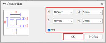 鋼材のサイズを追加する場合にクリックします。 表示される[サイズの追加・編集]ダイアログで、鋼材のサイズを入力し、[OK]ボタンをクリックします。