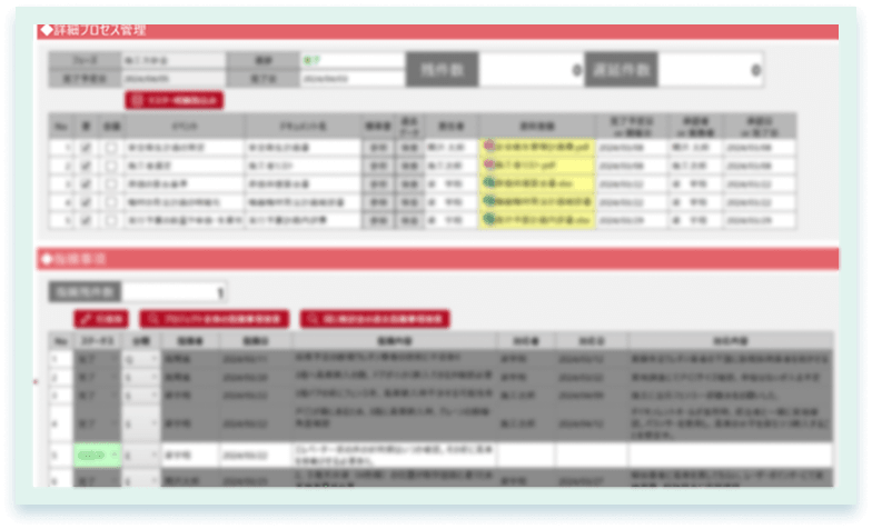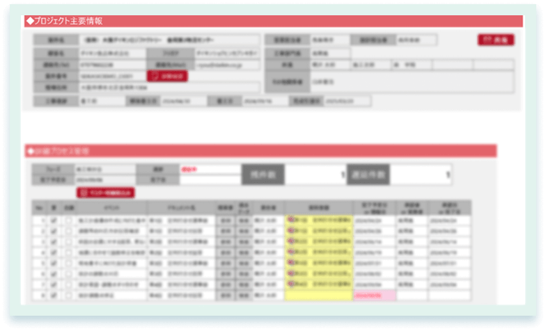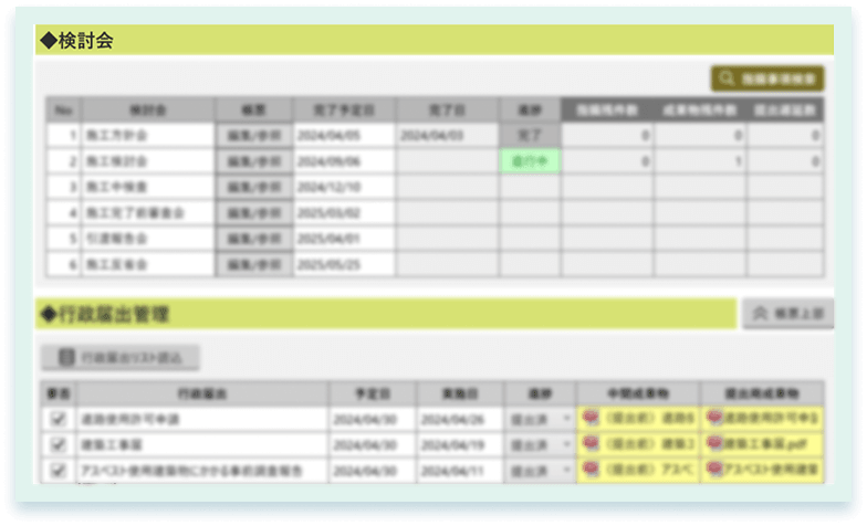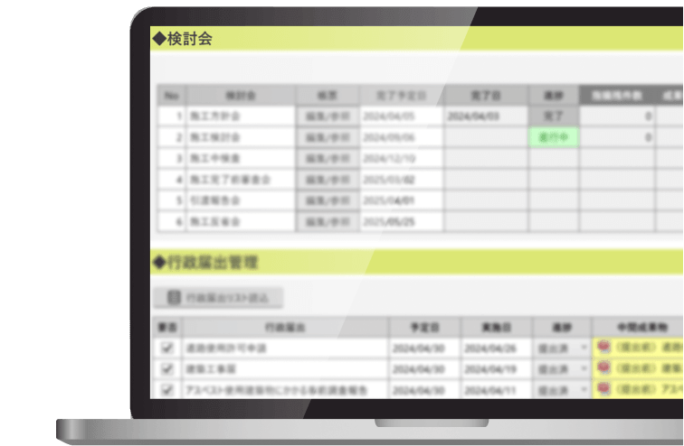 検討会の進行状況や行政届出資料の提出状況も帳票上で見える化することで、納期管理と課題管理ができます。
