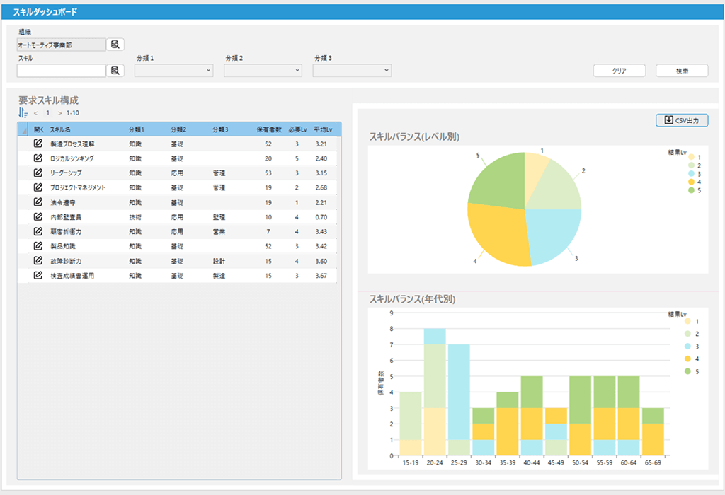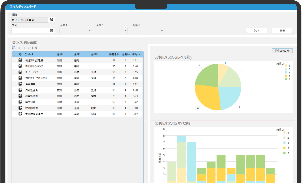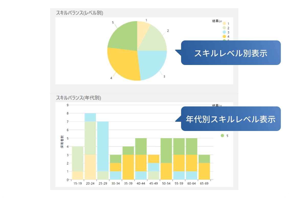 組織のスキルバランスを可視化し、将来を見据えた育成課題を把握できます。