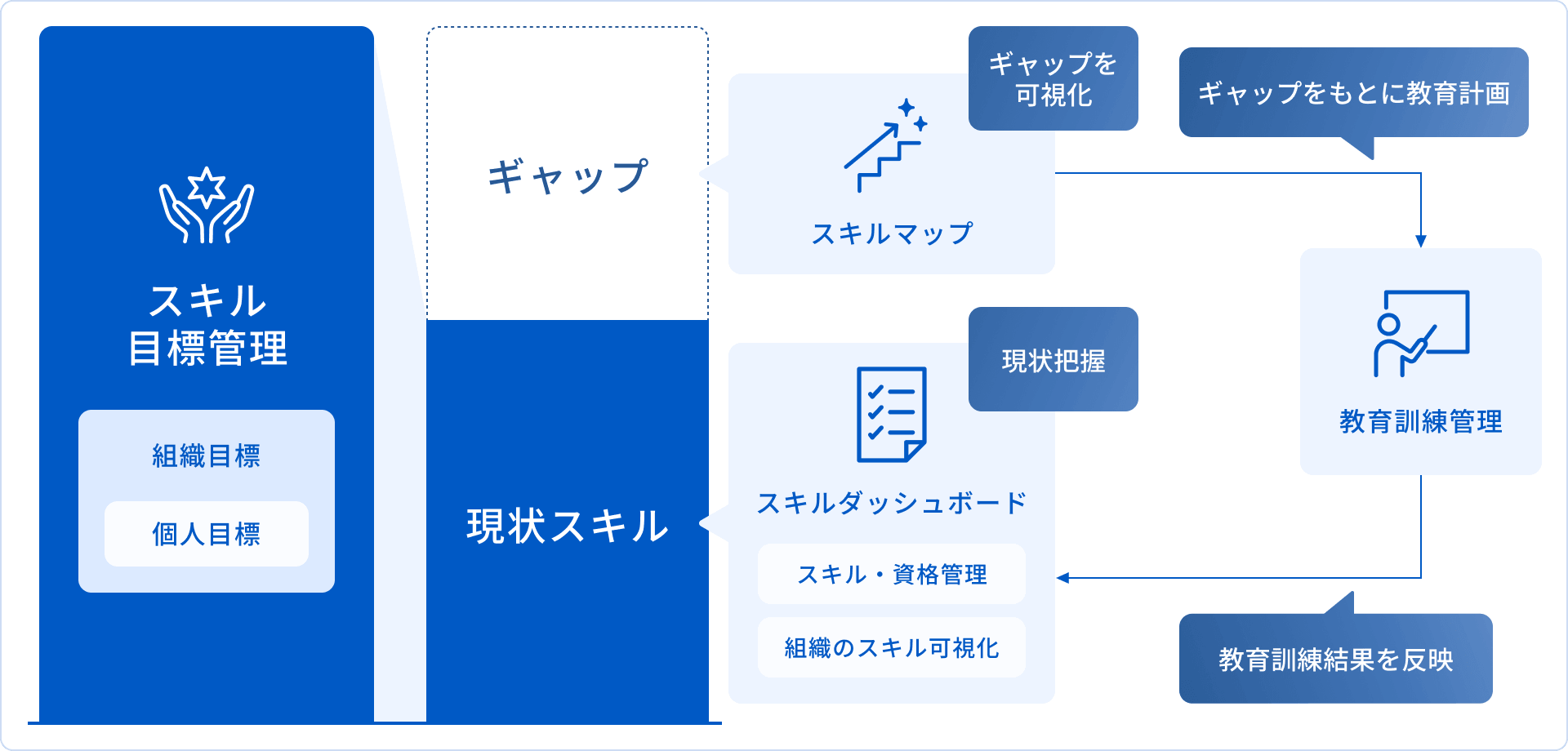 スキルマップで特定したギャップを埋める教育計画の策定・実行管理。実施後は、教育訓練記録が組織・個人の力量情報に反映されます。