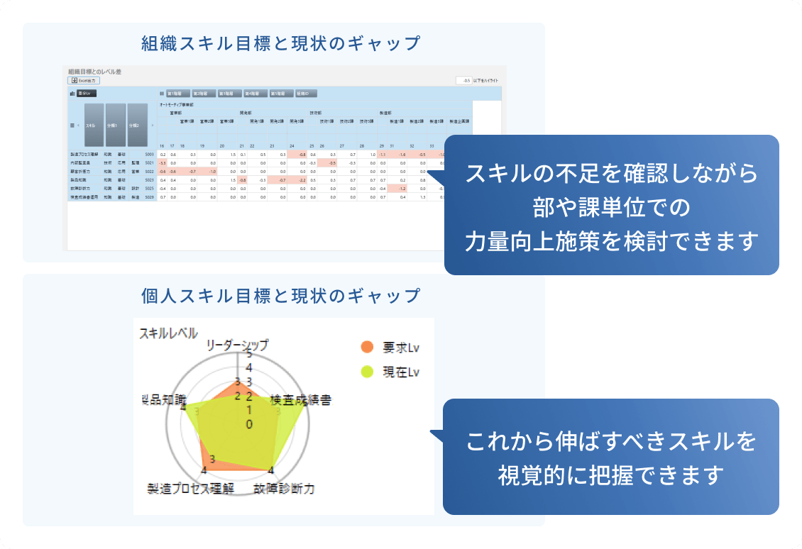 設定した「スキル目標」と「現状」を比較。ギャップを可視化し、優先すべき課題を浮き彫りにします。