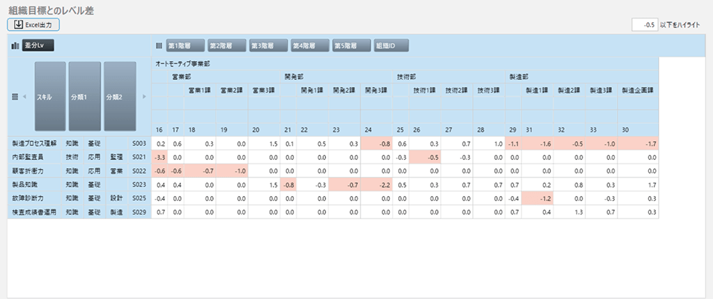 スキル目標と現状のギャップを可視化し、優先すべき課題を特定できます。